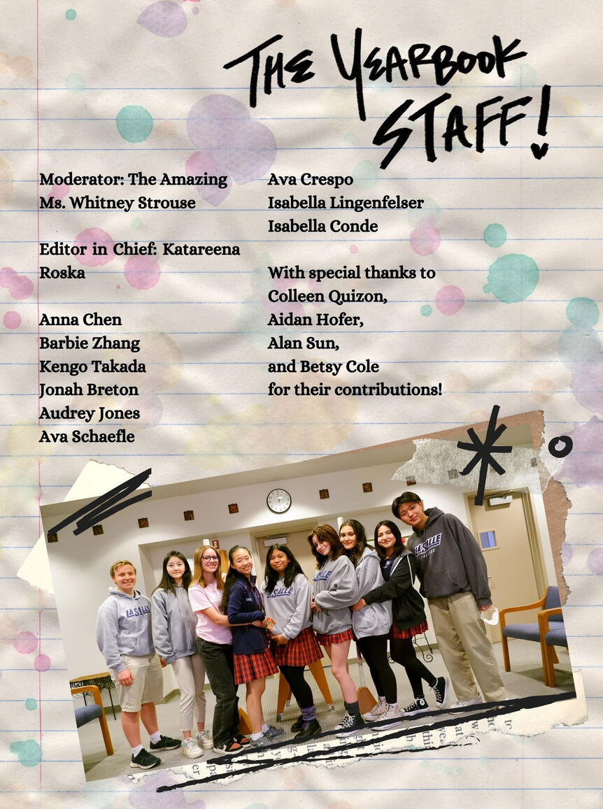 A Letter from the EditorI am a sentimental person. I tend to see it more of a weakness than a strength. I tear up over handwritten letters and sob over photos taken from years past. I keep every little note passed and stash away knick knacks from the events I have attended. It’s a habit that’s neared the brink of hoarding.This sentimentality of mine is exacerbated by a fear of forgetting, which strongly outweighs my fear of the dark. The latter can be easily solved with a flashlight, but it’s a bit harder to dispel the former.I’ve so far elected to remedy this fear through constantly taking photos and videos. From the moment I learned how to tap a shutter button, my phone has been filled to the maximum capacity of storage with moments I have long since forgotten and only recalled through my insatiable urge to remember everything exactly as it is. My memory might fail me when I grow old, but a photo won’t. I cherish our generation’s ability to document everything so effortlessly.To jump from online to in-person learning is no easy feat. As much as we’d all like to forget a pandemic, there is no denying that it will remain a part of our lives that have changed our trajectories and paths. Epiphanies have been forged through struggle and purposes have been questioned when life was still so uncertain.Watching and observing from afar with the occasional clicking of a camera, I have realized what I missed the most while quarantined in my room: people.There is so much to be said and learned from paying attention to people. Luxury lies in the details. Pixels on my screen have turned into hopeful eyes framed by rosy cheeks, hellos in hallways, and roaring laughter that cannot be silenced. Living is experiencing others. Humanity is hidden in brief moments of time.I joined yearbook to capture the little moments and details for people that I myself hold so dearly in my heart. Nostalgia is a drug that you can’t ever get enough of. I’ve had an amazing time remembering and never forgetting for others.The 2021-2022 Yearbook Committee agrees. We decided that a theme would overpower the message we wanted to send and ignore the years we have just gone through. And so, we landed on a theme that effectively paid tribute to what got us through everything.We present to you: The Memories that Make Us.I would like to thank my phenomenal and dedicated team of photographers and editors. You have made the job of remembering exceptionally easier. It is only with Anna Chen, Barbie Zhang, Jennifer Li, Antonio Pan Zhu, Audrey Jones, Ava Schaefle, Isabella Conde, Ava Crespo, Isabella Lingenfelser, Alan Sun, Kengo Takada, Mary Zhang, Jonah Breton, and Aidan Hofer that this yearbook lies before you today.Thank you to Michael and Seta from Yearbook Inc.! It takes an almost godlike patience and tolerance to answer the never ending questions from the painfully clueless. They have never once lacked complete support for our work, always prioritizing the best possible quality that could be delivered.Thank you to Ms. Strouse for taking the time out of her incredibly busy schedule to take on such a large and frustratingly complex project for the sake of the student body. She has been our steady guiding light throughout the entire process, encouraging our wildest ideas and pushing us to make them happen.But especially thanks to you. Your memories are what makes this yearbook special.Signing off,